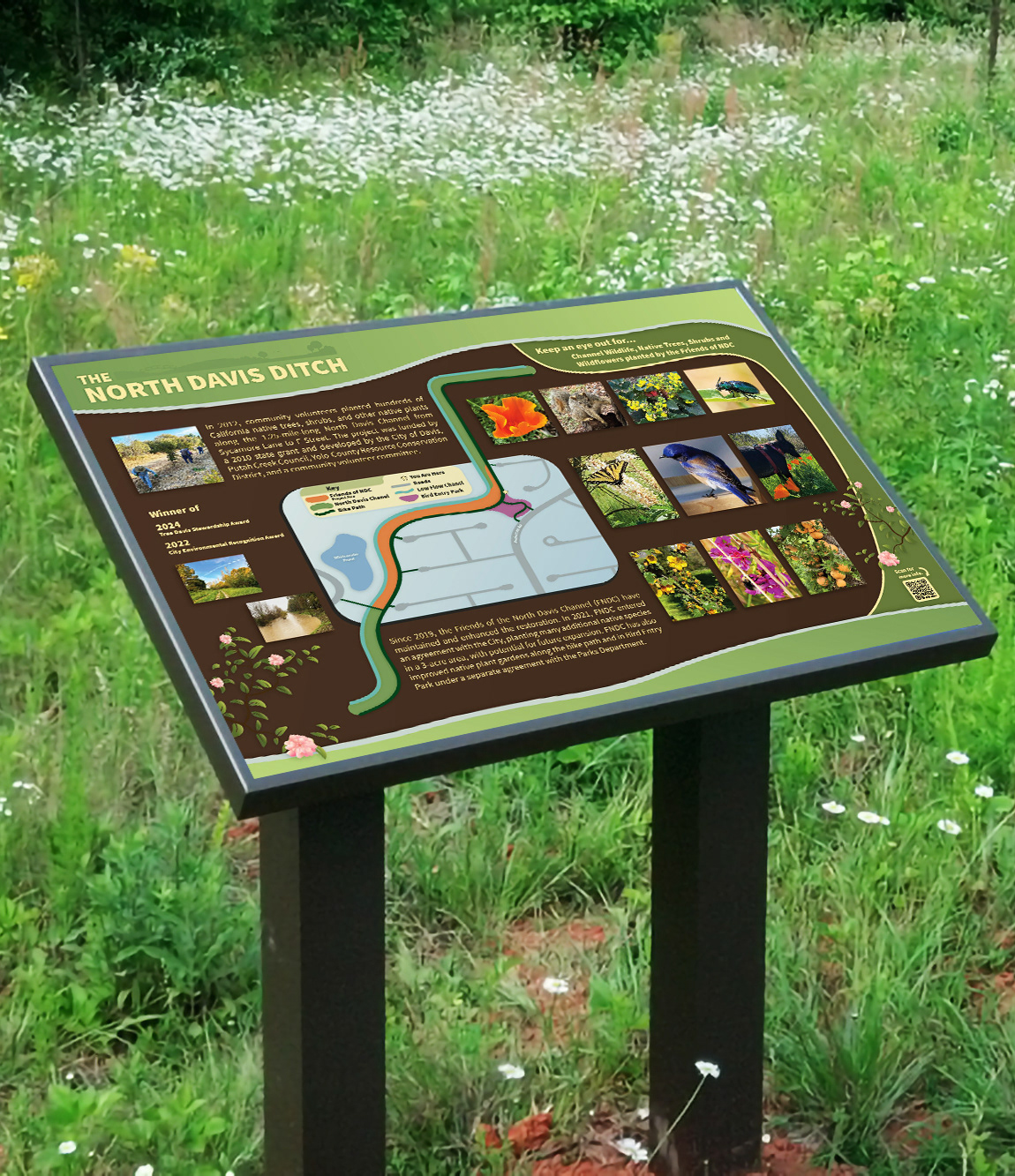 I collaborated with the nonprofit volunteer group Friends of the North Davis Channel to create an informative nature panel and accompanying brochure that highlights the group’s environmental initiatives and educates the public about local plants, wildlife, and conservation efforts. The project also includes a detailed map of trails and open spaces, designed for placement alongside an open space park and bike path. These works integrate visual storytelling, clear layout design, and engaging graphics to make the information accessible and memorable. This work demonstrates how thoughtful environmental communication and design can help communities connect with nature and support local conservation projects.